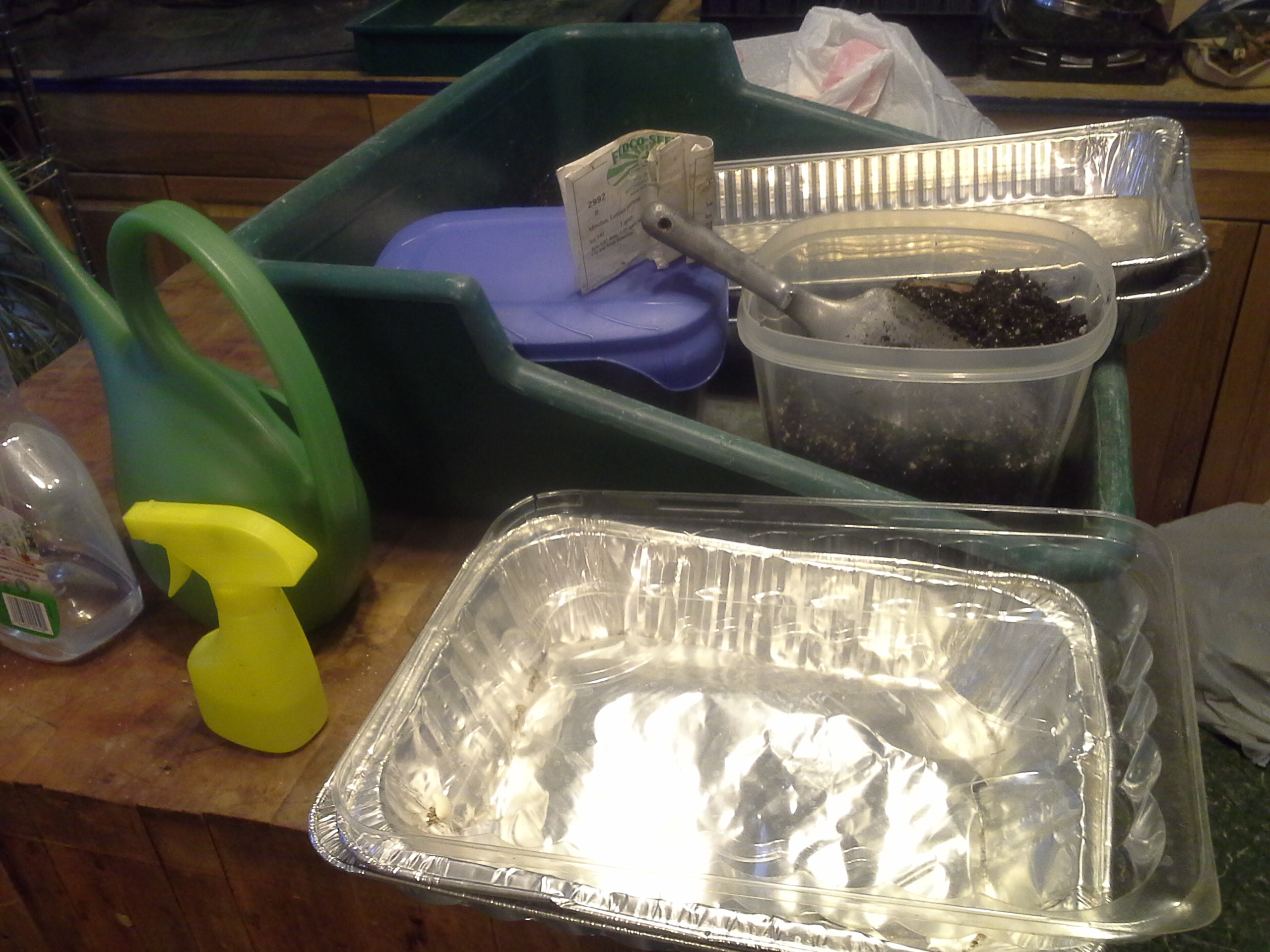 Instead, drumroll please…here we have our FIRST VIDEO INSTALLMENT of Let Us Eat Lettuce! Astute observers will note that there is a grower’s gizmo in the background, namely the grow light hanging from the ceiling. Rest assured that we’ll only be using the light from the south-facing window that you’ll see on the left side of the screen for our projects. That avocado tree lives next to the west-facing window that appears in back of me, and has grown just fine without artificial light. We do use the grow light for our garden starts, and I will introduce you to those, too, as they develop this winter and spring, but bear in mind, we decided to buy it after gardening for three or four years, and as we decided to expand our operation. Again, our goal here for this project is to get you growing some satisfying crops without having to come to that–yet. If I can manage to grow something in our characteristically disorganized and dishevelled state (don’t expect the background to change too much!), you can, too!